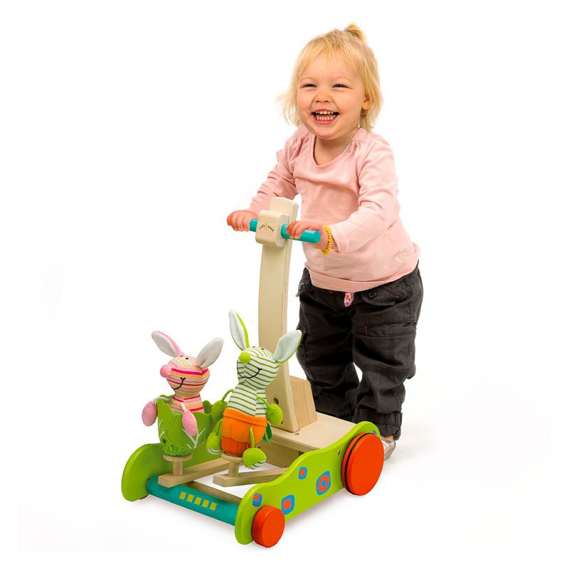 Fermecator, fabricat din lemn de foarte bună calitate, viu colorat si dotat cu doi iepurasi saltareti amuzanti, acest vehicul de impins este perfect pentru micutii care invata sa faca primii pasi.
