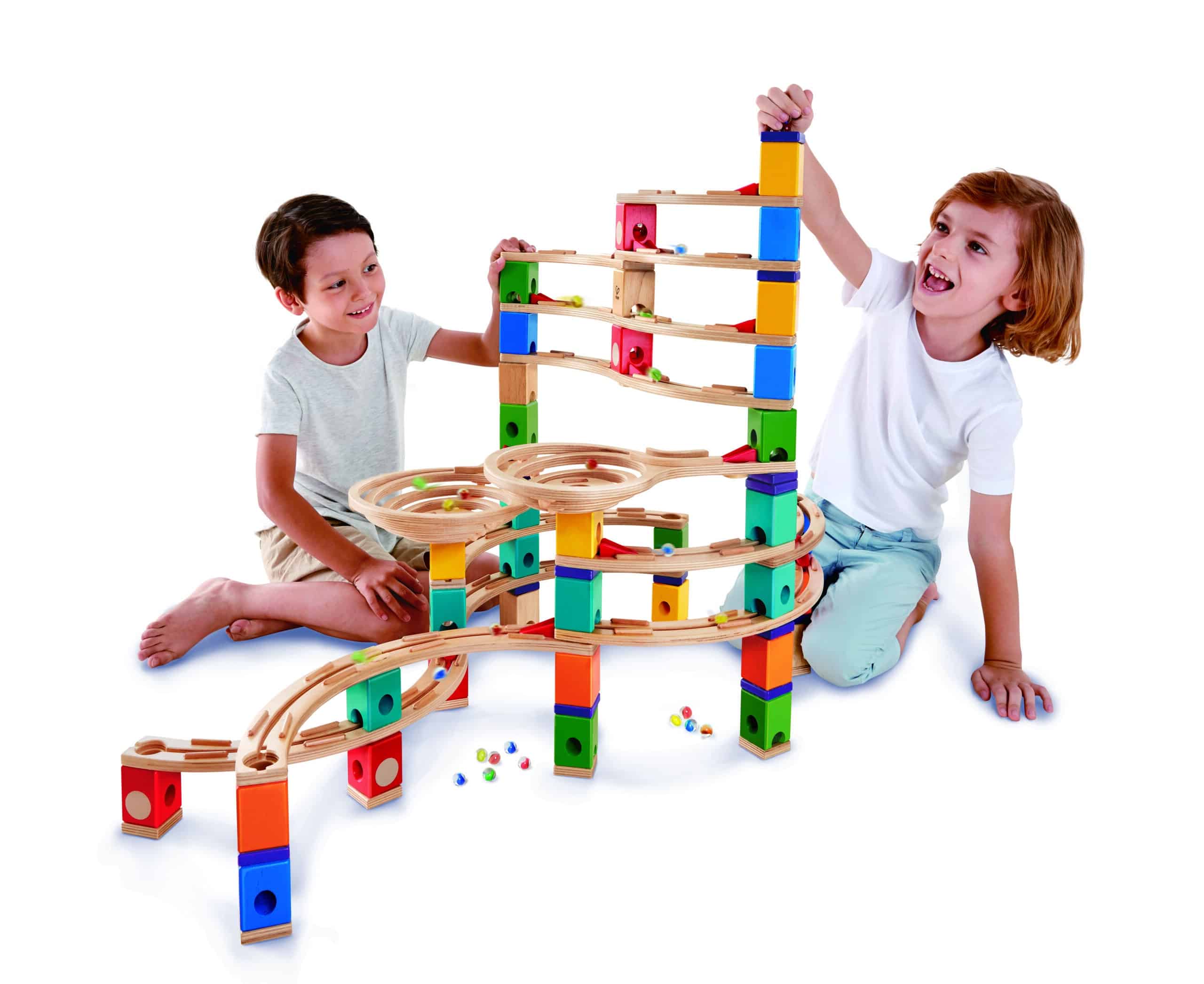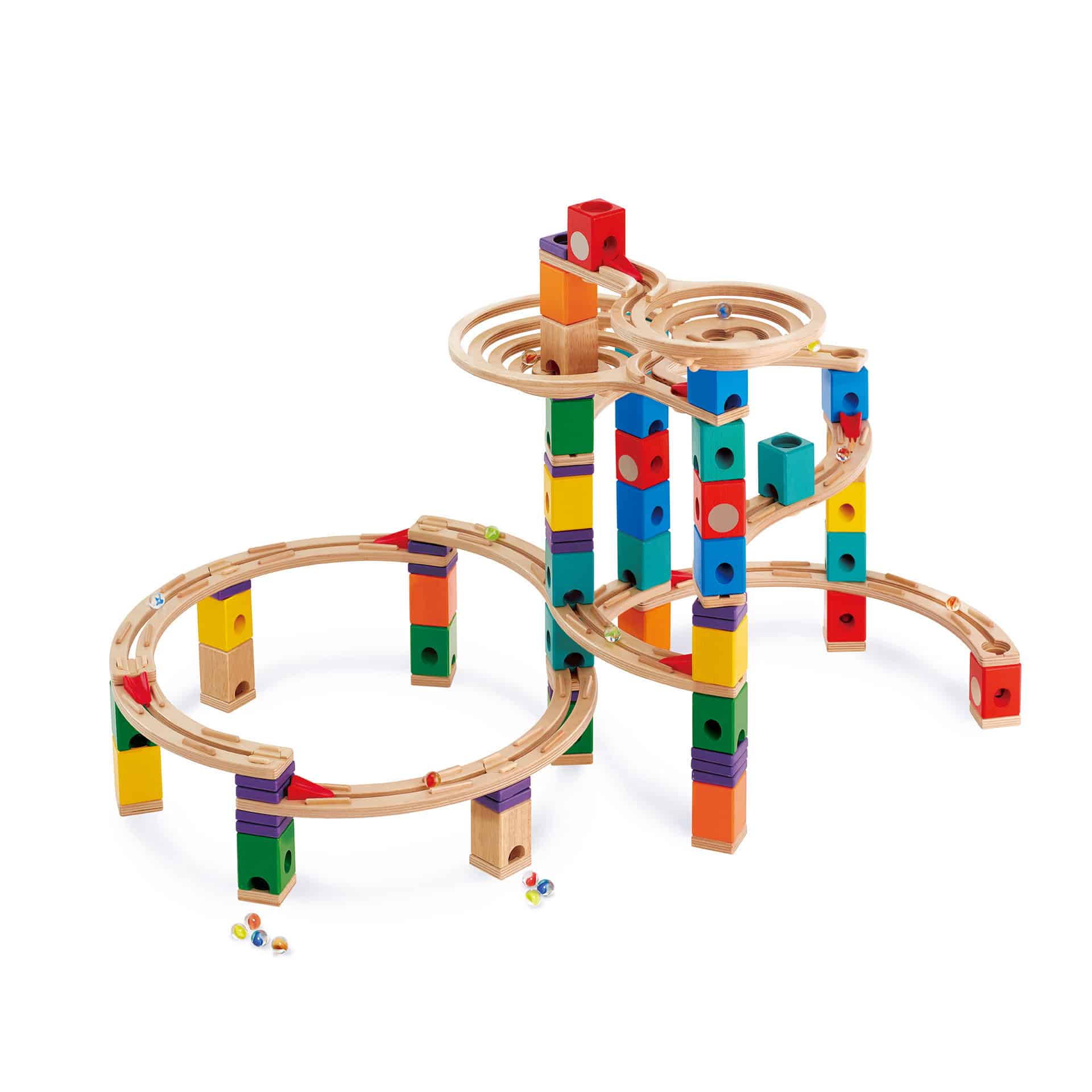 Palniile spiralate creeaza mai mult timp de rulare si va aduc mai aproape de actiune. Atrapatorul de bilele scoate un zgomot de vartej si opreste biletele sa fuga la sfarsitul fiecarei curse. Crearea fiecarui bloc de culoare pentru un scop diferit stimuleaza si incurajeaza gandirea logica si inginereasca la copii. Jucaria este realizata din lemn durabil si vopsele non-toxice pe baza de apa, ceea ce o face alegerea perfecta.