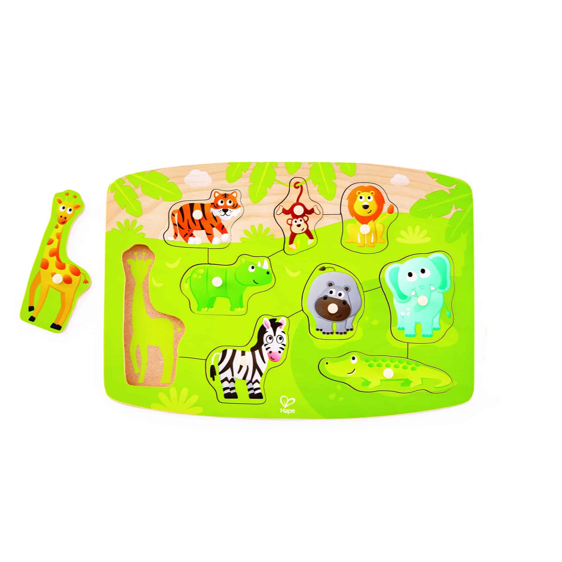 Iti plac animalele? Aflati mai multe despre animale si habitatele lor naturale cu puzzle-ul colorat si captivant. Un puzzle din lemn viu colorat care include o baza de puzzle si noua piese de puzzle de animale; un tigru, o girafa, o zebra, un hipopotan, un rinocer, un leu, o maimuta, un elefant si un crocodil.