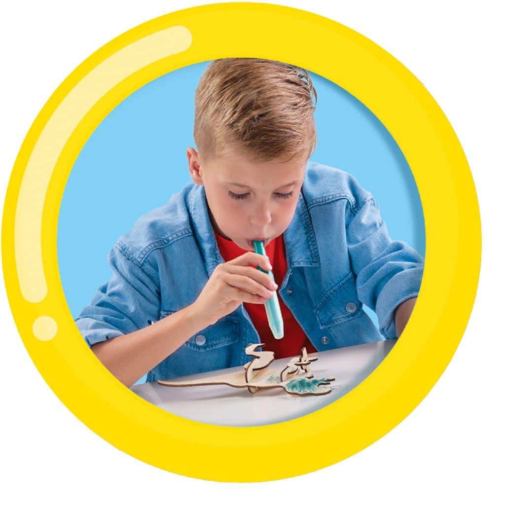 Acestea sunt markere speciale! In comparatie cu markerele normale, trebuie sa suflati pe acestea pentru a putea colora. Au un efect de pulverizare pe care il puteti folosi pentru a crea tranzitii de culoare cool! Acest set are doua rame de dinozaur din lemn pe care le puteti utiliza. Colorati cum doriti cu markerele cu aerograf.