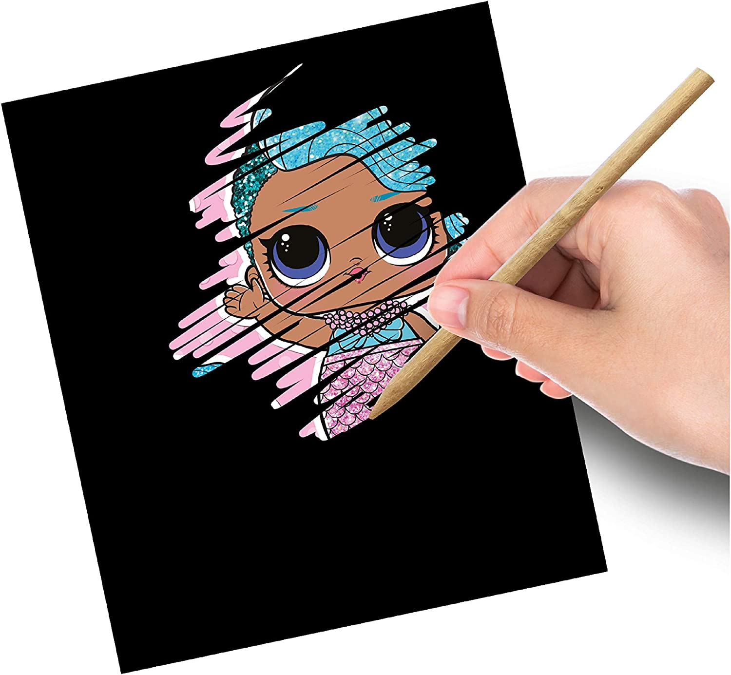 In acest set, vei gasi cinci carti de razuit negre. Dar exact care personaj L.O.L. Surprise se afla sub stratul negru de razuit este o surpriza. Prinde rapid stiloul de razuit furnizat si afla!